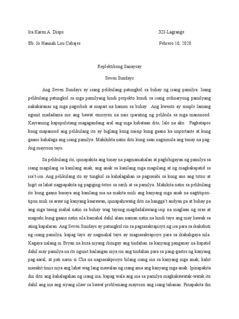 Malungkot ito sapagkat sa dulo ay may mamamatay na karakter. Repleksibong sanaysay Seven Sundays Ang pelikulang itoy tumutukoy sa isang pamilya na sinira ng galit. Jo Hannah Lou Cabajes 292020 REPLEKTIBONG SANAYSAY Seven Sundays Seven Sundays ay isang Philippine Komedy drama na idinirekta ni Cathy Garcia- Molina at inilabas ng Star Cinema noong taong 2017.