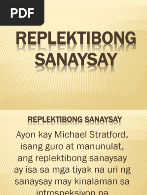 Nangangahulugan ito na nagkakaroon ng malalim na pagsusuri ang may-akda kung paano siya umunlad bilang tao kaugnay ng paksang binibigyang-pansin sa pagsulat. Ang replektibong sanaysay o Reflective Essay sa Ingles ay isang uri ng sanaysay na patungkol sa mga isyu opinyon karanasan o pangyayaring naisusulat ng may-akda nang komprehensibo kahit na hindi masyadong pinag-aralan ang isang paksa o isyu. Replektibong Sanaysay Patungkol Sa Isang Natatanging Karanasan Bilang Mag-aaral.
