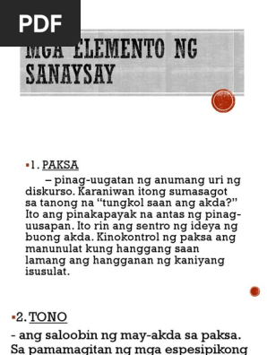 At di-pamilyar na salita. Karaniwan itong sumasagot sa tanong na tungkol saan ang akda. Save Save Mga Elemento Ng Sanaysay For Later.