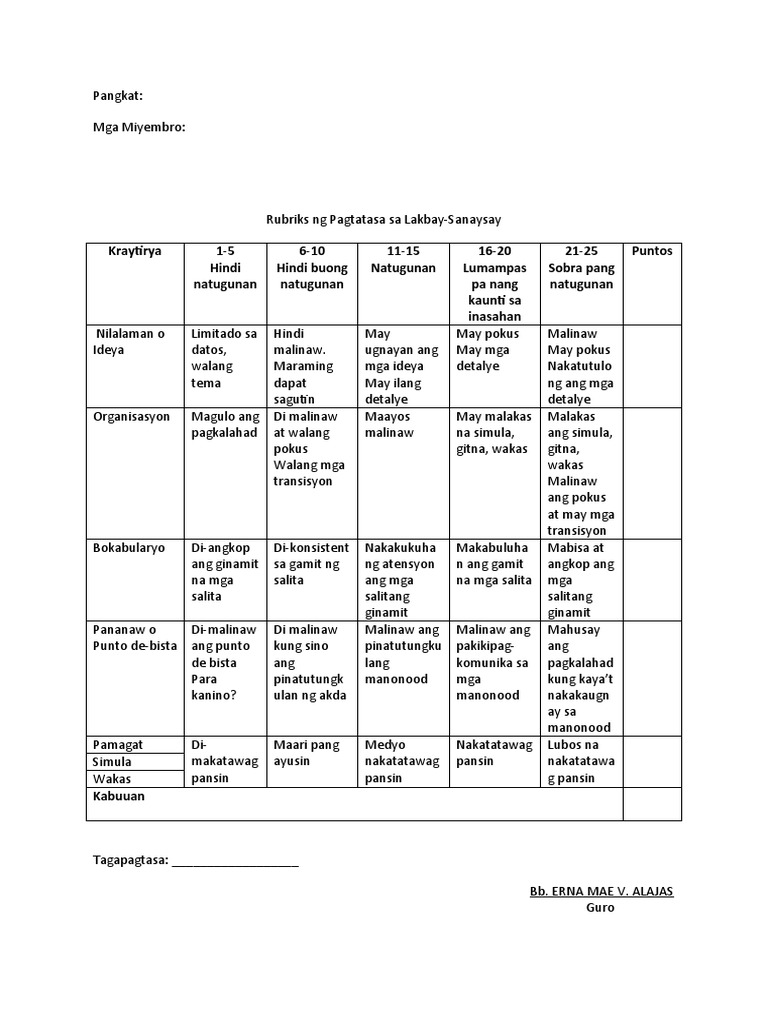 Rubriks Sa Lakbay Sanaysay Pdf