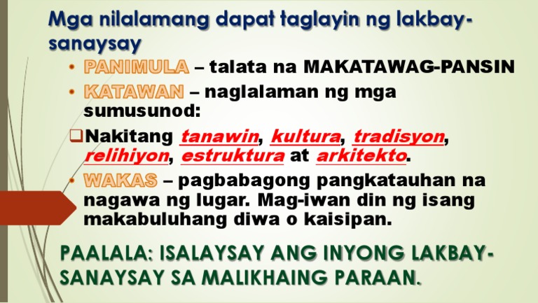 Maglahad ng naging karanasan sa. Kabilang rin dito ang kultura tradisyon pamumuhay uri nga mga tao eksperyensya mula sa awtor at lahat ng. Ang ibig sabihin ng Lakbay Sanaysay o Travel Essay sa wikang Ingles ay sanaysay na ang pinanggagalingan ng mga ideya nito ay mula sa pinuntahang lugar hindi lamang ang lugar ang tinatampok dito pati na rin ang mga kultura tradisyon pamumuhay uri ng mga tao damdamin ng isang taong nakaranas pumunta sa partikular na lugar at lahat ng aspektong.