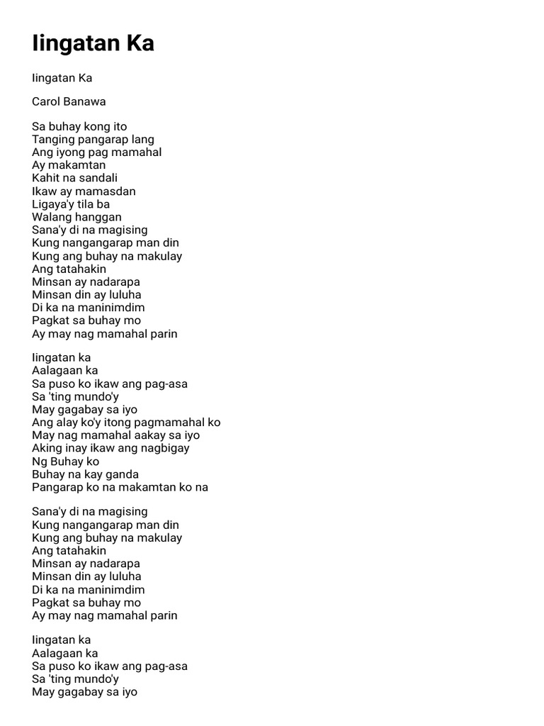 Pakikinig sa awiting Iingatan Ka Ang awiting Iingatan ka na kinanta ni Carol Banawa ay naghatid ng maraming gintong aral sa mga pamilyang Pilipino- mga magulang mga anak at sa bawat miyembro. Nasa module yan kapatid mag basa ka. There are 60 lyrics related to Ano Ang Mensahe Ng Kantang Iingatan Ka.