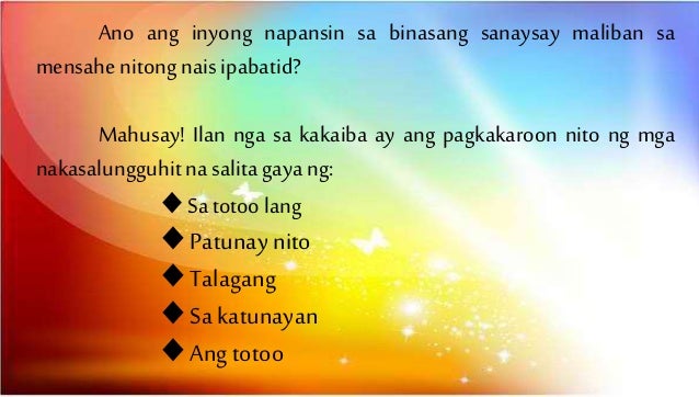Narito ang ilang halimbawa ng tuwirang pahayag na salin din sa di-tuwirang pahayag. Nakatutulong sa pag-unawa ng mensahe Nagiging mas malinaw ang sanaysay talumpati Madaling matukoy ang mga katotohanan at opinion May mga pang-ugnay na nagpapatibay o nagpapatotoo sa isang argumento upang makahikayat. Maaaring gamitin ang sumusunod na mga transitional deviceGawin ito sa iyong sagutang papel.