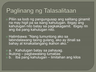 GITNA o KATAWAN Inilalahad sa bahaging ito ang iba pang karagdagang kaisipan o pananaw kaugnay ng tinalakay na paksa upang patunayan o suportahan ang inilahad na pangunahing kaisipan. Isa-isahin ang mga elemento na ginamit sa sanaysay. Pumupuna at pumupuri 2.