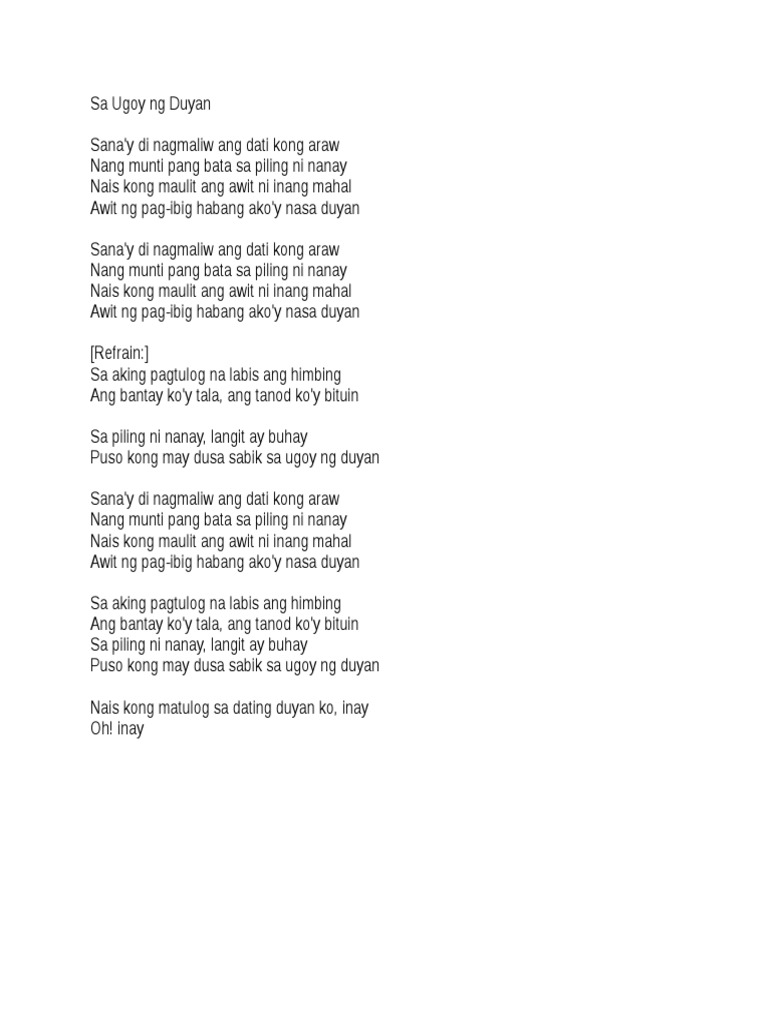 Sa aking pagtulog na labis ang himbing ang bantay koy tala ang tanod koy bituin sa piling ni nanay langit ay buhay puso kong may dusa sabik sa ugoy ng duyan makikita sa verse na ito na labis ang pagdadalamhati ng persona sa kasalukuyan kaya labis din ang kaniyang pangungulila sa kaniyang nanay sapagkat sa piling ng kaniyang ina siya ay. Sa piling ni nanay. Naabutan kong nagsasandok si Nanay ng kakainin namin.